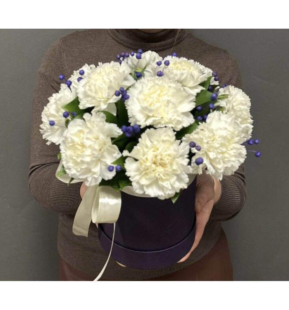 Белоснежные гвоздики в шляпной коробке - это изысканный букет, состоящий из нежных белоснежных гвоздик, которые символизируют чистоту, искренность и вечную любовь. Этот букет является прекрасным подарком для выражения своих чувств и создания особенной атмосферы. Шляпная коробка придает букету уникальный и стильный вид, делая его еще более привлекательным и роскошным. Этот композиция будет прекрасным украшением на любом торжественном мероприятии или просто прекрасным способом порадовать близких и дорогих людей.